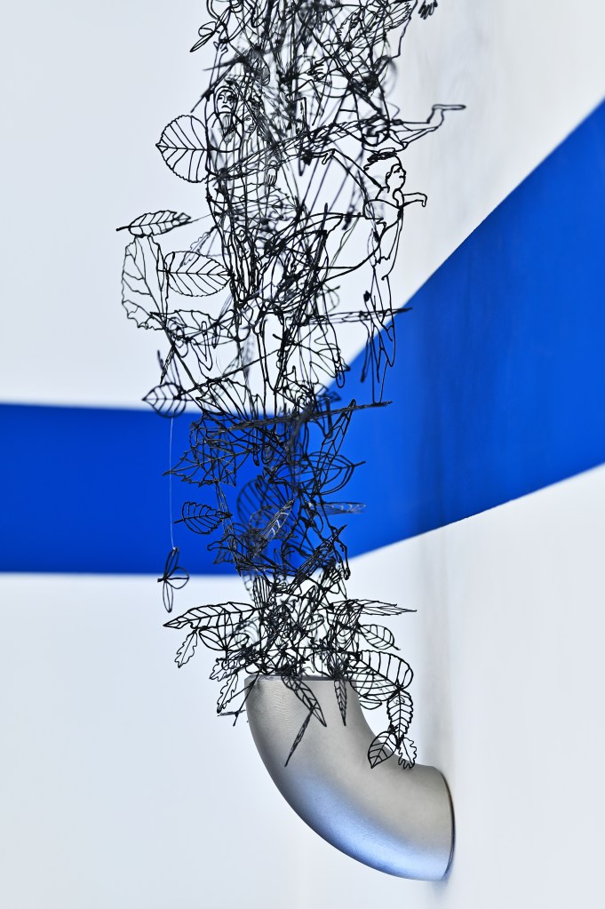 It evokes a panistic dimension that emerges from an organic constellation of real forms, like a swarm, or perhaps a cloud, that, hungry for space, expands toward the only alien element within the entire composition: a stainless-steel tube produced by the company itself. In its bright sobriety, the tube reaffirms its anthropic, mechanical, and industrial nature, a human attempt to impose order upon the world.
