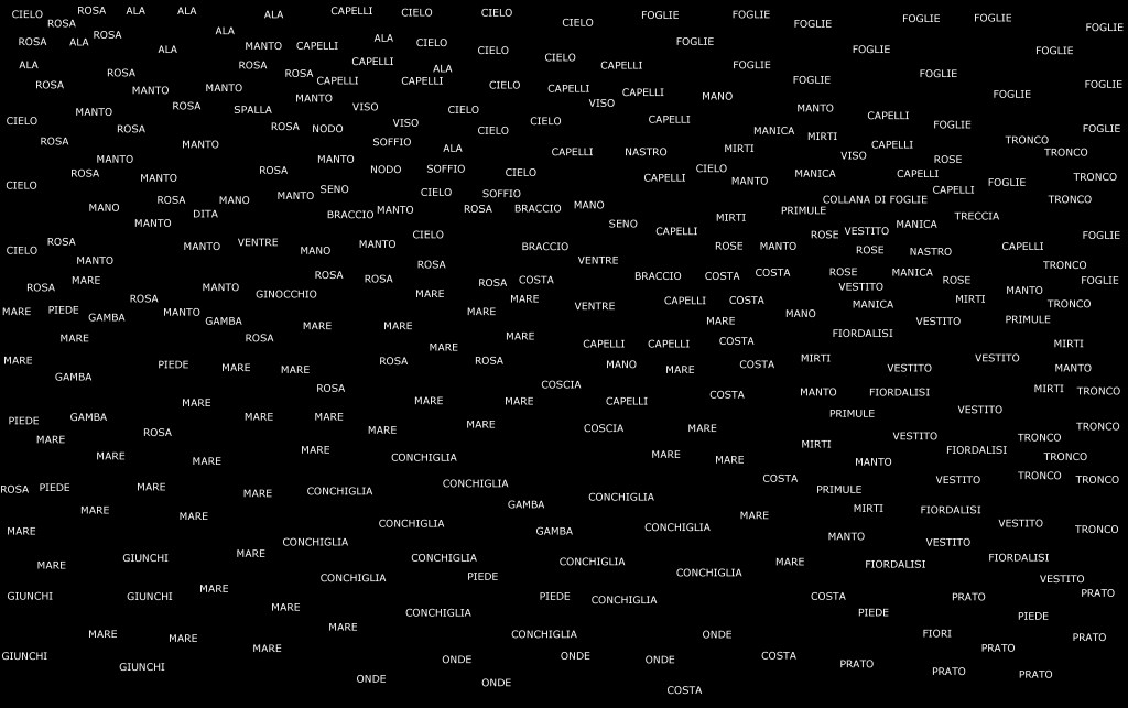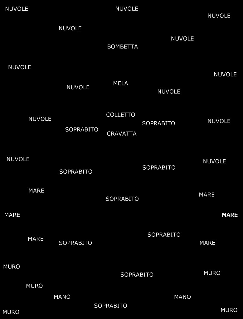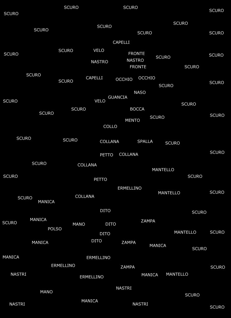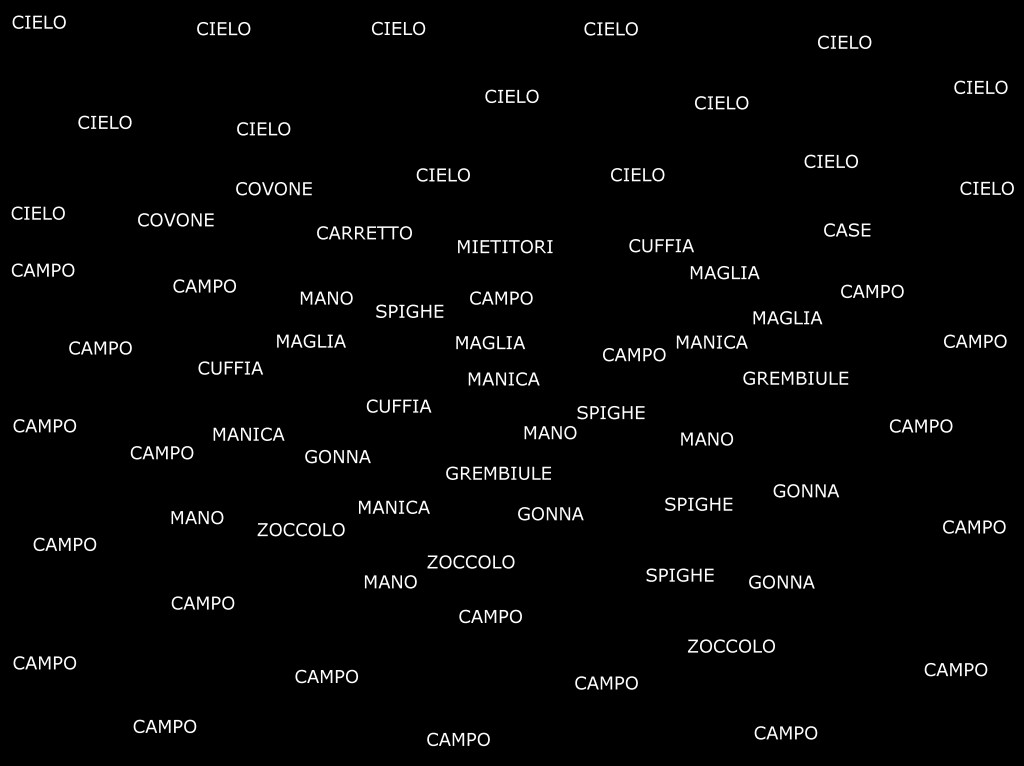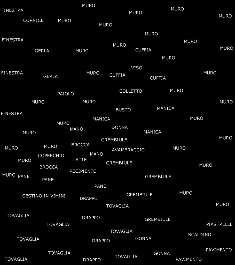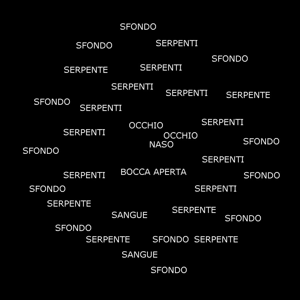 The result is a series of semantic maps based on iconic artworks, in which each word takes the physical place of its corresponding visual element. In doing so, the viewer is invited to reconstruct the image mentally, through the network of relationships between words arranged in space.