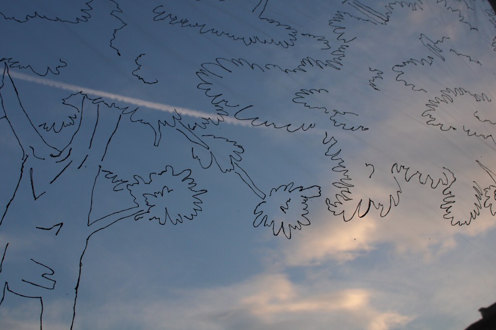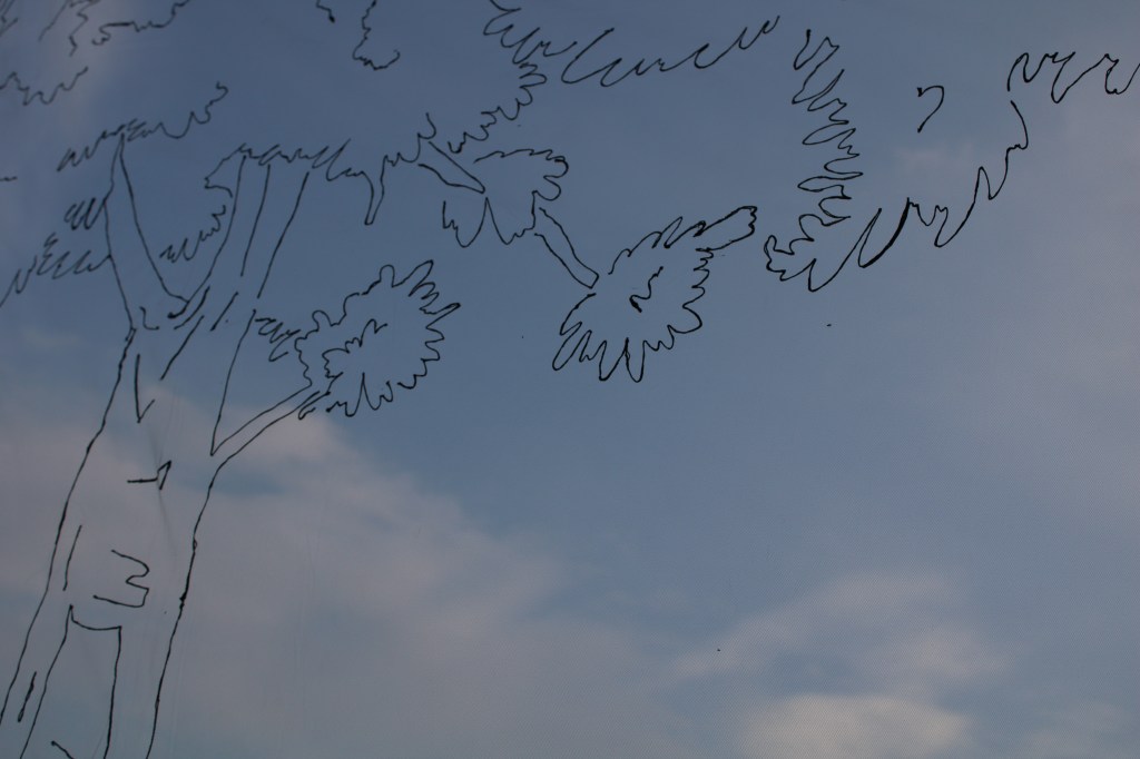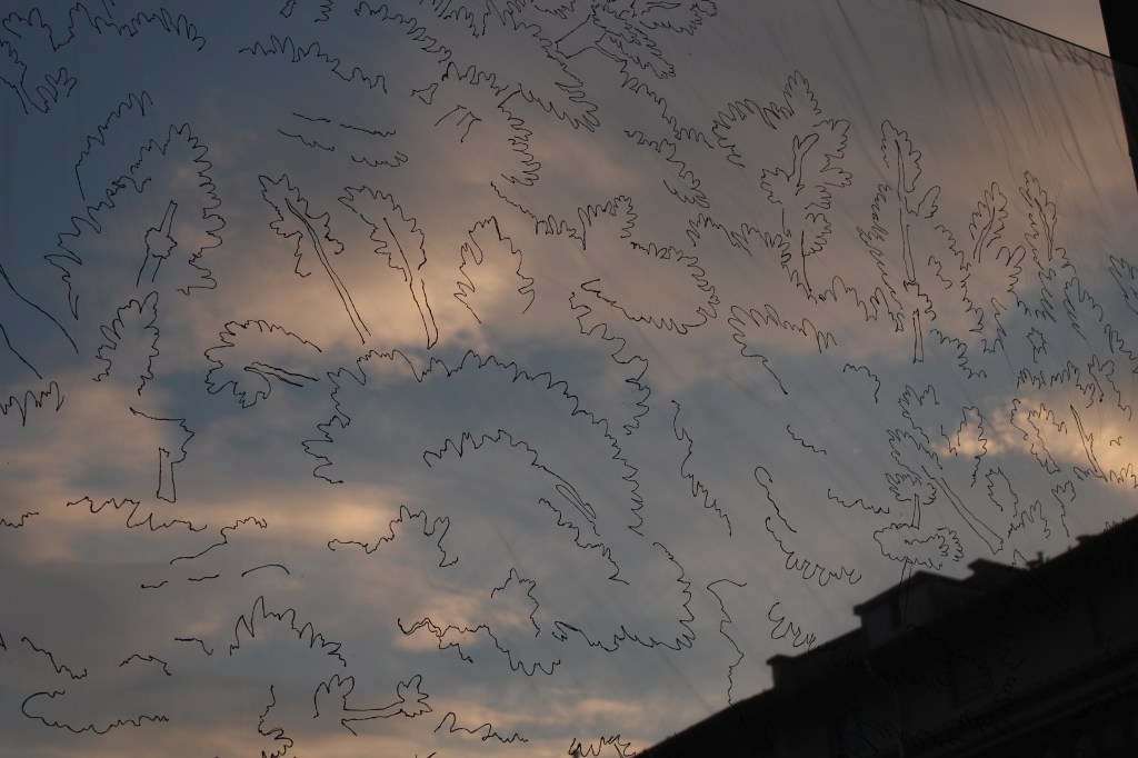 The work attempts to imagine the trace of a time, past, or perhaps yet to come, made not of buildings, houses, and cars, but of simple trees. Here, like mirages, appear two or three vigorous trees, drawn with a bold black line, solid enough to stand out against the reality behind them. Layers of perception and thought overlap: now the trees prevail over the palaces, now the opposite. It is a continuous dialogue and confrontation, where the absurd conflict between the natural and the artificial emerges; a reflection on humanity’s ignorance of its own being and of its arboreal origins, forgotten in favor of the narcissistic cult of anthropic creation.