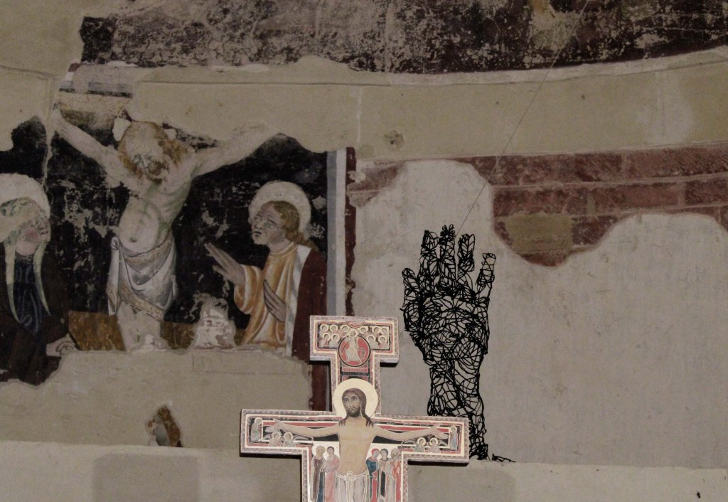 The solid light, made of a tulle veil drawn with spontaneous herbs and pollinating insects, emerges from the round window and from the divine hand placed outside the church. It crosses the space, thinning as it advances, and ends by barely touching a human, rural hand made of leaves.